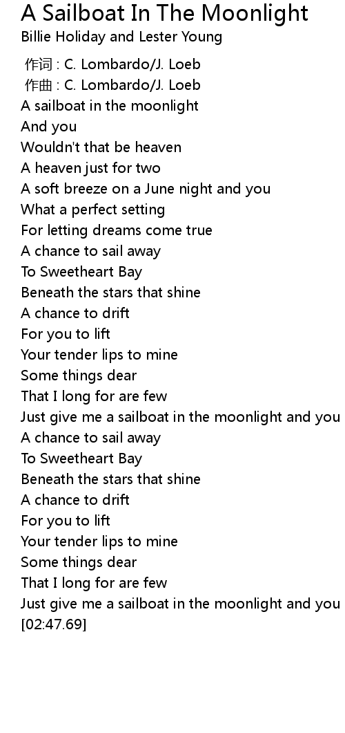 | [02:37.52] | Just give me a sailboat in the moonlight and you |