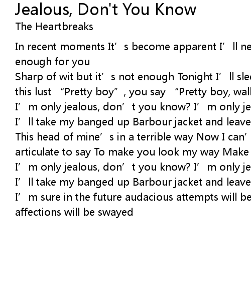| I' m only jealous, don' t you know? I' m only jealous, don' t you know? I' ll take my banged up Barbour jacket and leave | |