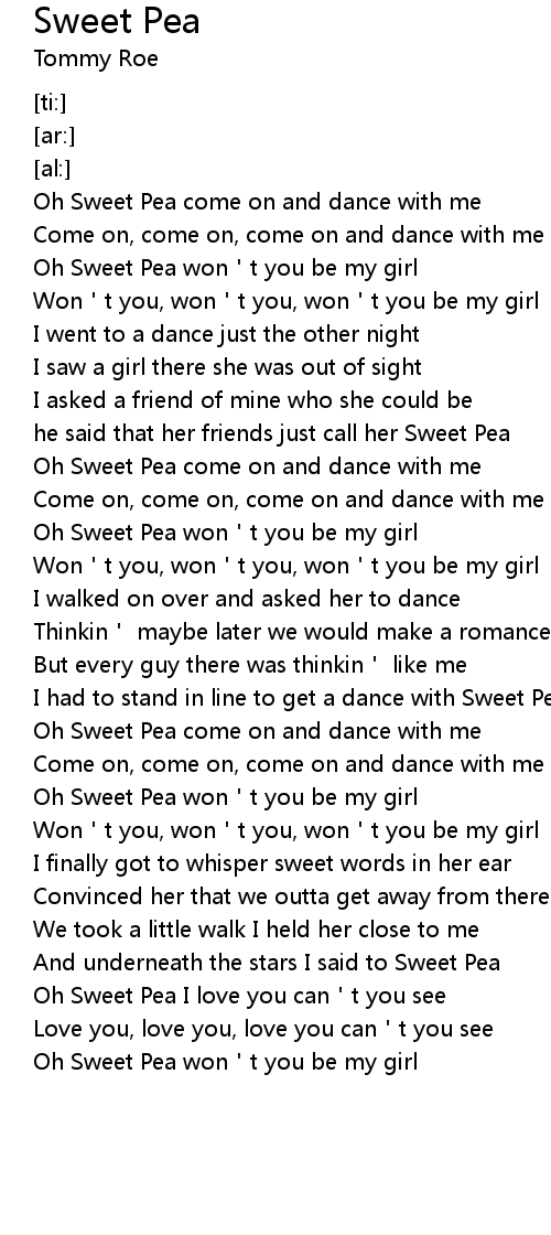 | [00:08.28] | Oh Sweet Pea come on and dance with me |