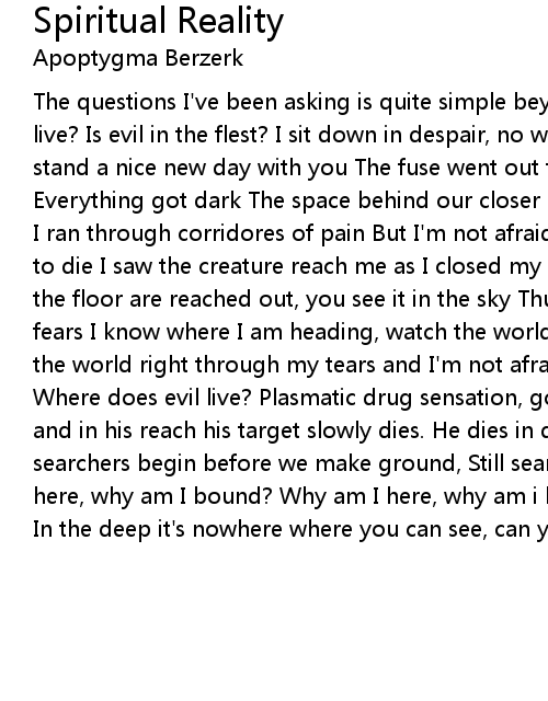 The questions I've been asking is quite simple beyound my reach; Where does evil live? Is evil in the flest? I sit down in despair, no way to run away Couldn't stand a nice new day with you The fuse went out today Who's around me? Everything got dark The space behind our closer goes through corridores of pain I ran through corridores of pain But I'm not afraid to die 'cause I'm not afraid to die I saw the creature reach me as I closed my faith to die The plastic in the floor are reached out, you see it in the sky Thunderballs are softening my fears I know where I am heading, watch the world right through my tears I watch the world right through my tears and I'm not afraid to die -not afraid to die Where does evil live? Plasmatic drug sensation, going weakened through the year and in his reach his target slowly dies. He dies in distant fear But now the searchers begin before we make ground, Still searching for the truth; Why am I here, why am I bound? Why am I here, why am i bound? and I'm not afraid to die In the deep it's nowhere where you can see, can you feel the light? |