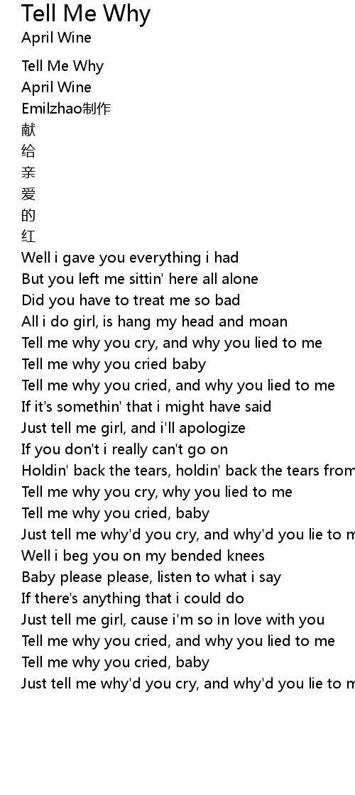 | [00:53.47] | Tell me why you cried, and why you lied to me |