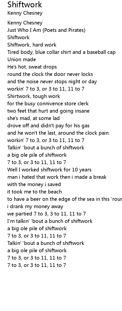 workin' 7 to 3, or 3 to 11, 11 to 7 |