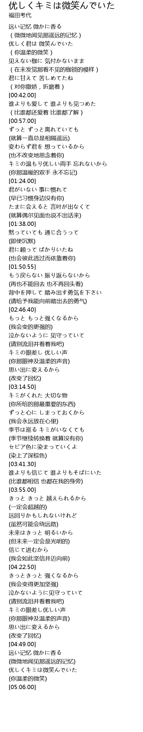 | [04:56.30] | 优しくキミは微笑んでいた |