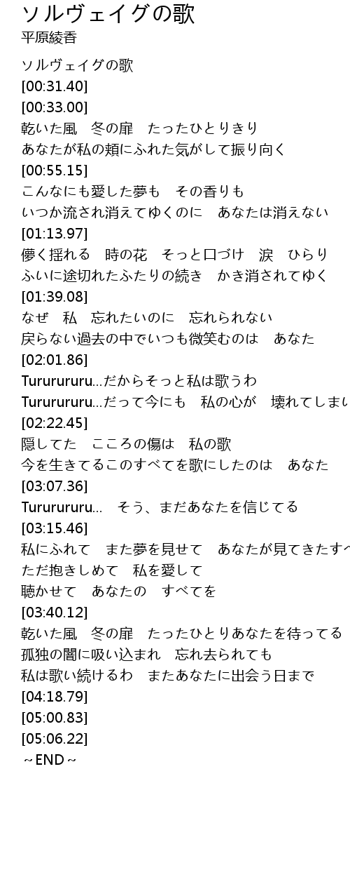 | [00:34.72] | 乾いた風 冬の扉 たったひとりきり |