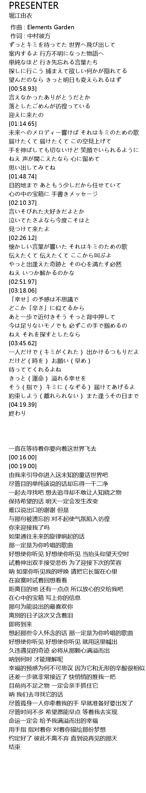 | [02:26.43] | 懐かしい言葉が響いた それはキミのための歌 |