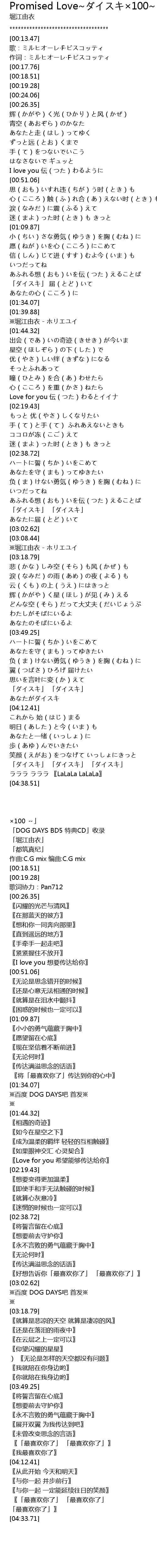 | [02:55.76] | 「ダイスキ」 「ダイスキ」 あなたに届(とど)いて |