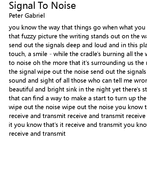 you know the way that things go when what you fight for starts to fall and in that fuzzy picture the writing stands out on the wall so clearly on the wall send out the signals deep and loud and in this place, can you reassure me with a touch, a smile - while the cradle's burning all the while the world is turning to noise oh the more that it's surrounding us the more that it destroys turn up the signal wipe out the noise send out the signals deep and loud man i'm losing sound and sight of all those who can tell me wrong from right when all things beautiful and bright sink in the night yet there's still something in my heart that can find a way to make a start to turn up the signal wipe out the noise wipe out the noise wipe out the noise you know that's it you know that's it receive and transmit receive and transmit receive and transmit you know that's it you know that's it receive and transmit you know that's it you know that's it receive and transmit |
