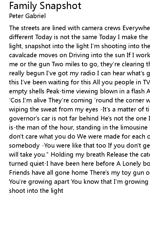 The streets are lined with camera crews Everywhere he goes is news Today is different Today is not the same Today I make the action Take snapshot into the light, snapshot into the light I'm shooting into the light Four miles down the cavalcade moves on Driving into the sun If I worked it out right They won't see me or the gun Two miles to go, they're clearing the road and The cheering has really begun I've got my radio I can hear what's going on I've been waiting for this I've been waiting for this All you people in TV land I will wake up your empty shells Peak-time viewing blown in a flash As I burn into your memory cells 'Cos I'm alive They're coming 'round the corner with the bikers at the front I'm wiping the sweat from my eyes -It's a matter of time -A matter of will And the governor's car is not far behind He's not the one I've got in mind 'Cos there he is-the man of the hour, standing in the limousine "I don't really hate you -I don't care what you do We were made for each other -Me and you I want to be somebody -You were like that too If you don't get given you learn to take And I will take you." Holding my breath Release the catch And I let the bullet fly All turned quiet-I have been here before A Lonely boy hiding behind the front door Friends have all gone home There's my toy gun on the floor Come back Mum and Dad You're growing apart You know that I'm growing up sad I need some attention I shoot into the light