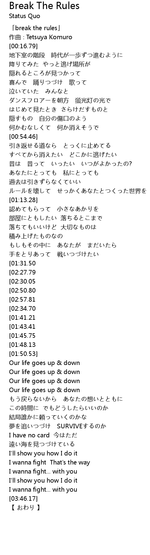 | [02:53.22][02:34.70][01:39.38] | Let's Break the rules |