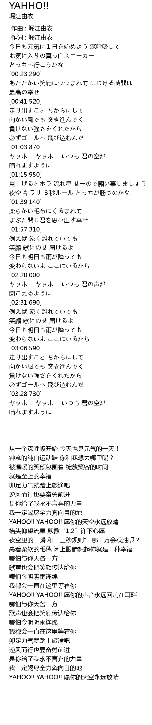 | [03:29.070] | ヤッホー ヤッホー いつも 君の空が 晴れますように |