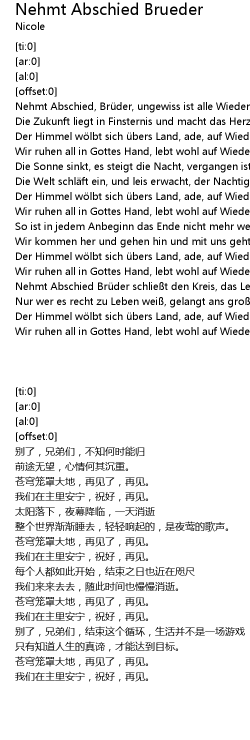 | [01:37.41] | Wir ruhen all in Gottes Hand, lebt wohl auf Wiedersehn. |