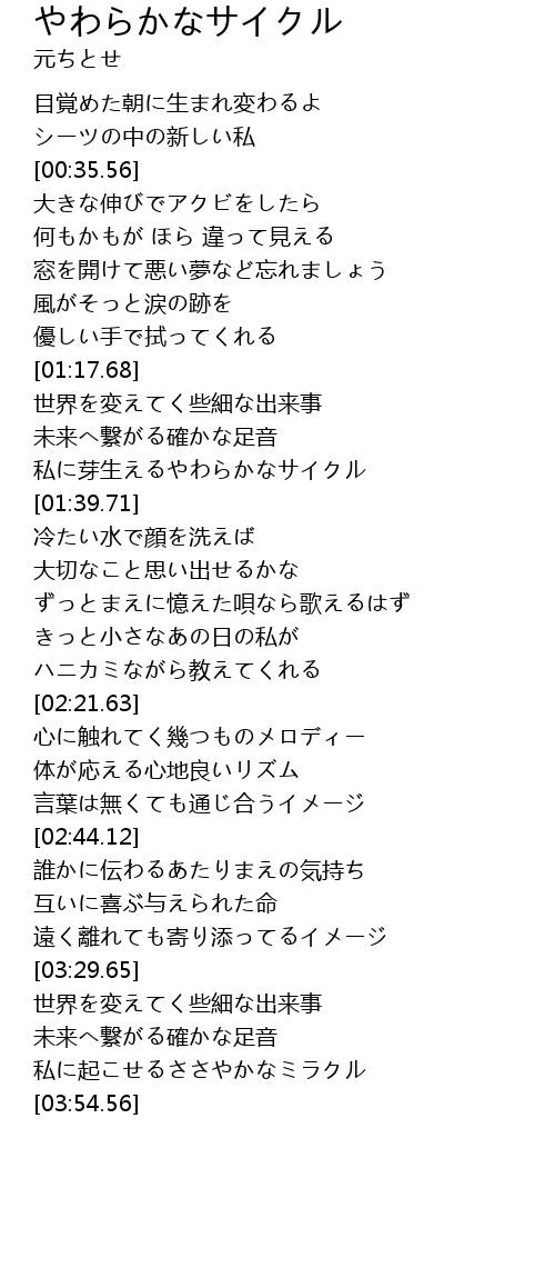 | [01:30.47] | 私に芽生えるやわらかなサイクル |