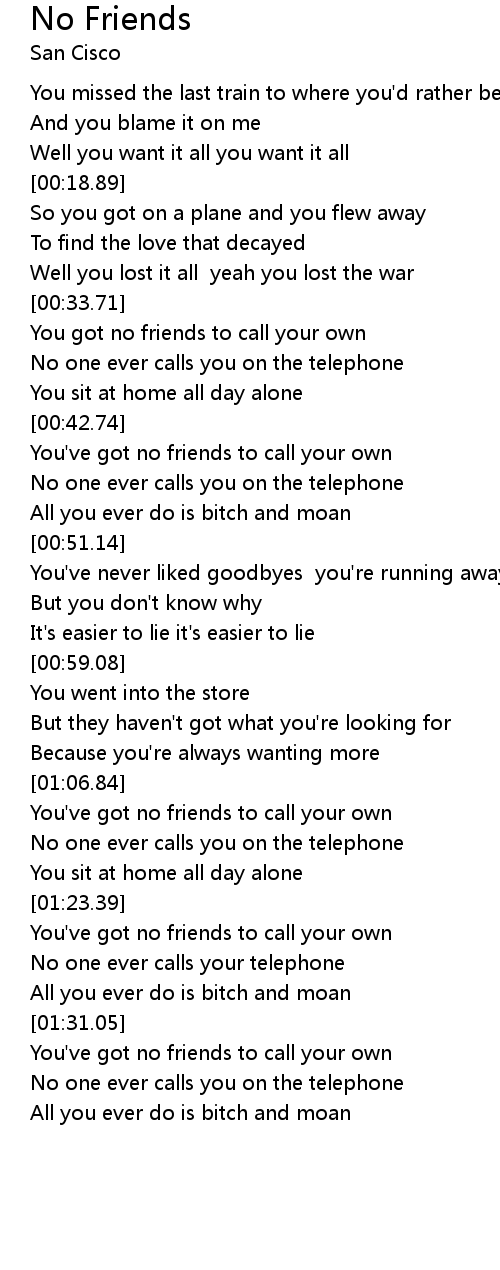 | [01:17.05] | You've got no friends to call your own |