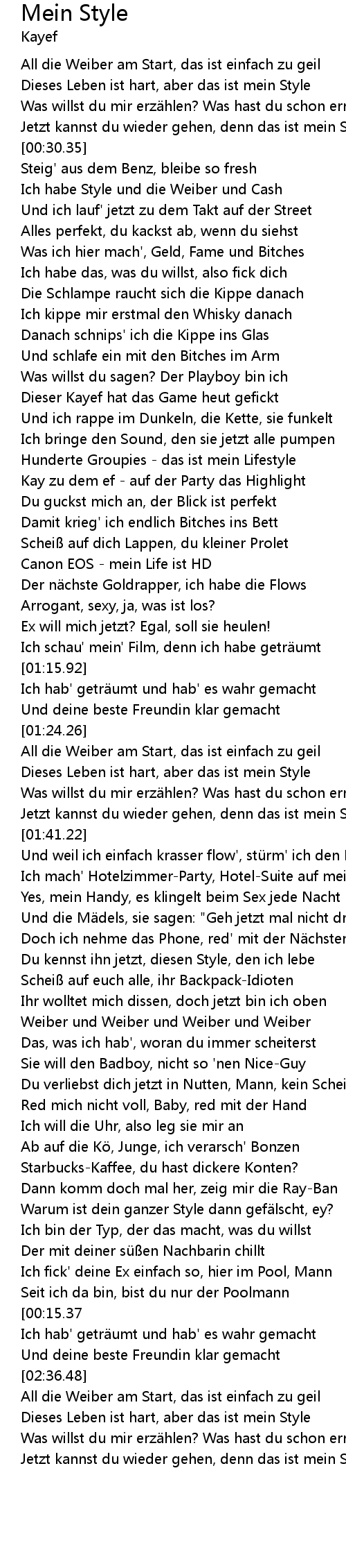 | [02:51.28] | Jetzt kannst du wieder gehen, denn das ist mein Style |