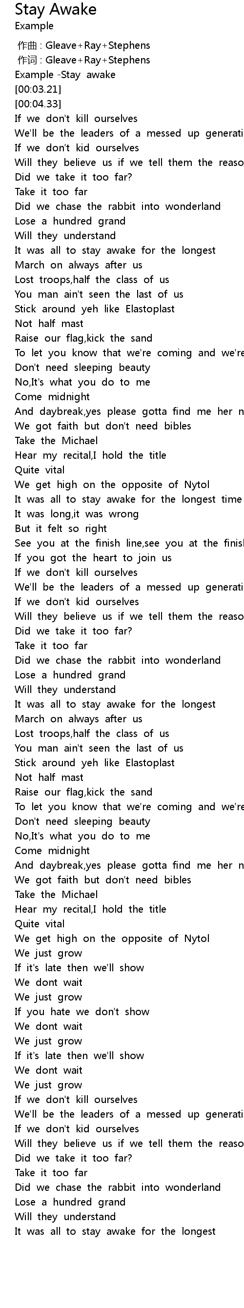 | [00:00.67] | Example -Stay awake |