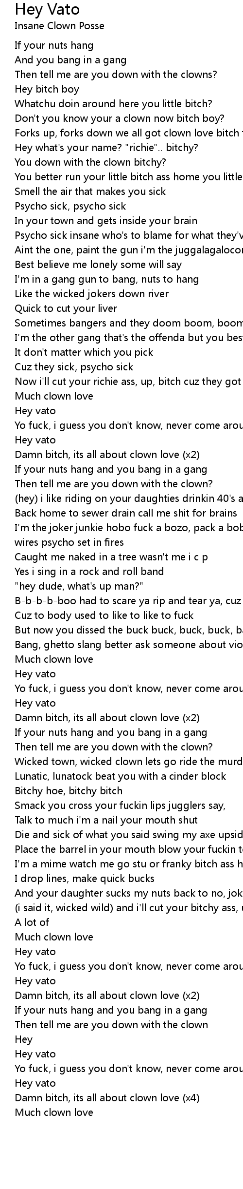 (hey) i like riding on your daughties drinkin 40's at clown parties then i go |