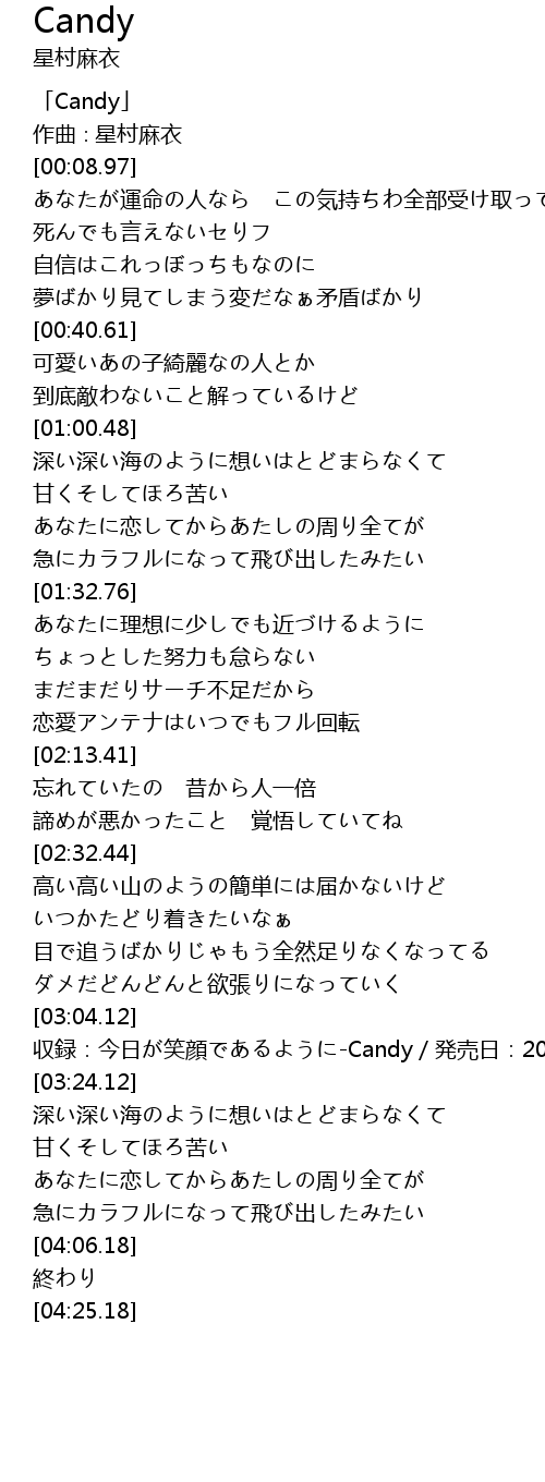 | [03:14.12] | 収録:今日が笑顔であるように-Candy/発売日:2010/12/1 |