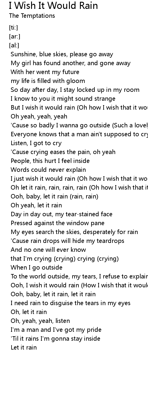 [01:15.44] I just wish it would rain (Oh how I wish that it would rain)
