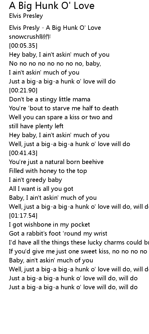 | [00:17.66] | Just a big-a big-a hunk o' love will do |