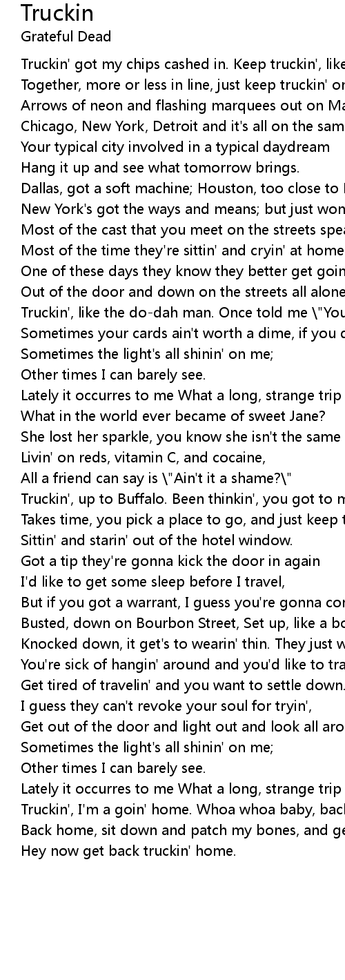 Truckin', I'm a goin' home. Whoa whoa baby, back where I belong, |
