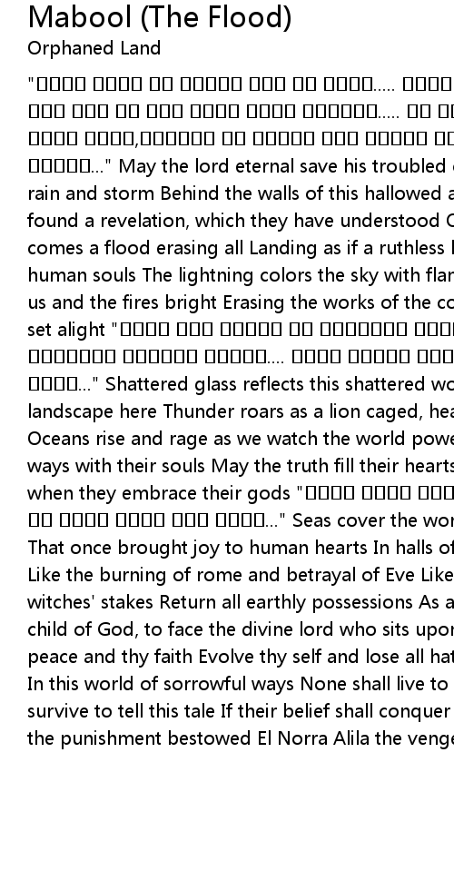 | "הנני מביא את המבול מים על הארץ..... לשחת כל בשר אשר בו רוח חיים מתחת השמיים..... כל אשר בארץ יגוע,ומחיתי את היקום אשר עשיתי מעל פני האדמה..." May the lord eternal save his troubled child As he passes through rain and storm Behind the walls of this hallowed ark of wood Our holey prophets found a revelation, which they have understood Onto the lands of fearful heaven comes a flood erasing all Landing as if a ruthless bird of prey to crush all human souls The lightning colors the sky with flames of light Hell shines above us and the fires bright Erasing the works of the common man, all we hold dear is set alight "ביום הזה נבקעו כל מעיינות תהום רבה... וארובות השמיים נפתחו.... וימי המבול היו על הארץ..." Shattered glass reflects this shattered world barren is the landscape here Thunder roars as a lion caged, heat that comes like waves of fear Oceans rise and rage as we watch the world powers fall Redeeming their sinful ways with their souls May the truth fill their hearts, let them see the light, when they embrace their gods "והנה חרבו פני האדמה..... שופך דם האדם ואדם דמו ישפך..." Seas cover the works of timeless art That once brought joy to human hearts In halls of infamy this day shall live Like the burning of rome and betrayal of Eve Like the fire raised at the witches' stakes Return all earthly possessions As ashes you return to earth, child of God, to face the divine lord who sits upon the throne - eyes sad Go in peace and thy faith Evolve thy self and lose all hate So a heaven you may create In this world of sorrowful ways None shall live to see the light of day Some may survive to tell this tale If their belief shall conquer this gale Damnation is the punishment bestowed El Norra Alila the vengeful God |