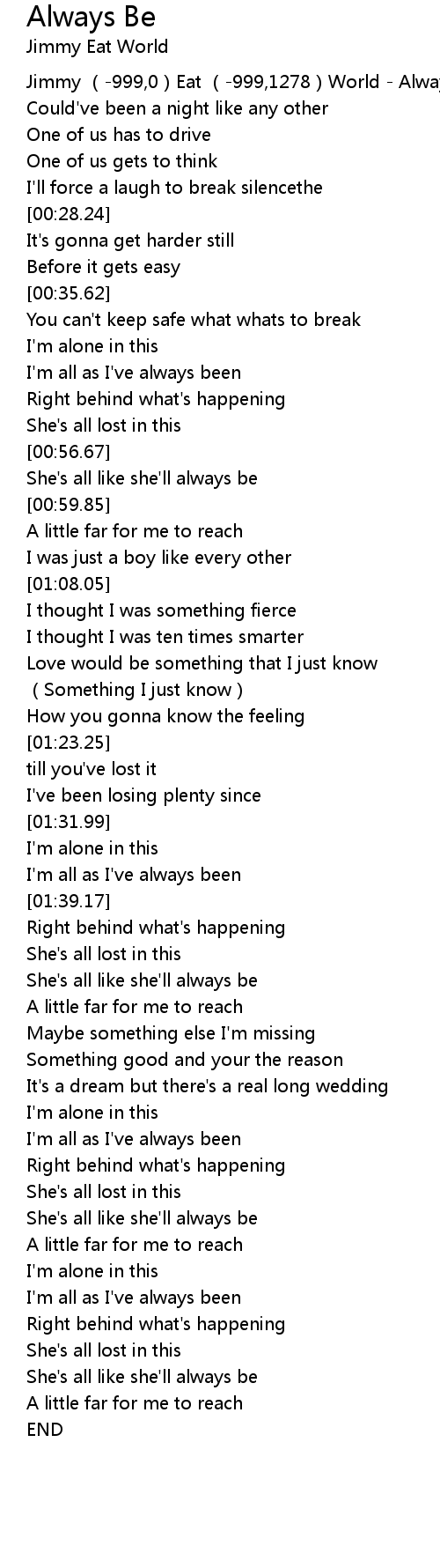 | [00:-1.00] | Jimmy (-999,0)Eat (-999,1278)World - Always Be |