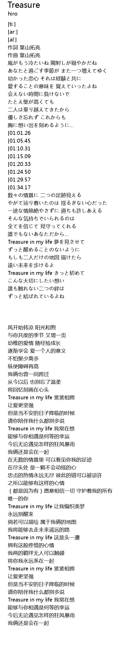 | [03:56.33][01:20.33] | Treasure in my life si |