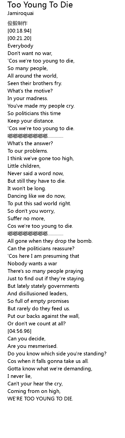 | [05:10.20] | WE' RE TOO YOUNG TO DIE. |