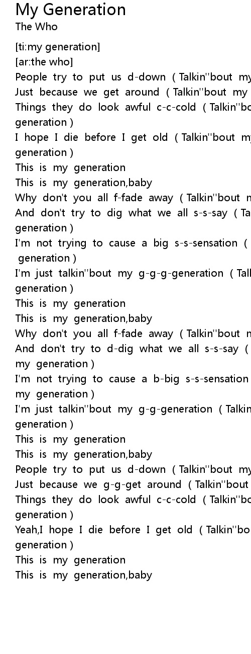 | [00:09.780] | People try to put us ddown Talkin'' bout my generation |
