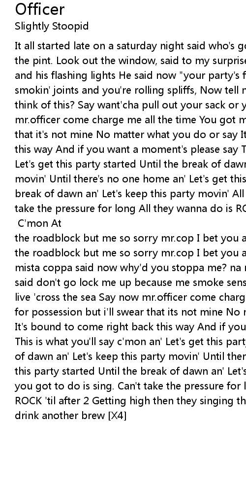 It all started late on a saturday night said who's got the spliffs and who's got the pint. Look out the window, said to my surprise Here comes the man in blue and his flashing lights He said now "your party's fuckin' over with Because ya smokin' joints and you're rolling spliffs, Now tell me what'cha think i oughta think of this? Say want'cha pull out your sack or you be missed." Say now mr.officer come charge me all the time You got me for possesion, but i swear that it's not mine No matter what you do or say It's bound to come right back this way And if you want a moment's please say This what you'll say c'mon an' Let's get this party started Until the break of dawn an' Let's keep this party movin' Until there's no one home an' Let's get this party started Until the break of dawn an' Let's keep this party movin' All you got to do is sing. Can't take the pressure for long All they wanna do is ROCK 'til after 2 Getting high then they singing this song Snap another b then drink another brew [X2] C'mon At the roadblock but me so sorry mr.cop I bet you anything me gonna get stopped At the roadblock but me so sorry mr.cop I bet you anything me gonna get stopped Hey mista coppa said now why'd you stoppa me? na na I wasn't driving the car badly I said don't go lock me up because me smoke sensi Yes, this is the ghetto but i live 'cross the sea Say now mr.officer come charge me all the time You got me for possession but i'll swear that its not mine No matter what you do or say It's bound to come right back this way And if you want a moment's please say This is what you'll say c'mon an' Let's get this party started Until the break of dawn an' Let's keep this party movin' Until there's no one home an' Let's get this party started Until the break of dawn an' Let's keep this party movin' All you got to do is sing. Can't take the pressure for long All they wanna do is ROCK 'til after 2 Getting high then they singing this song Snap another b then drink another brew [X4] |