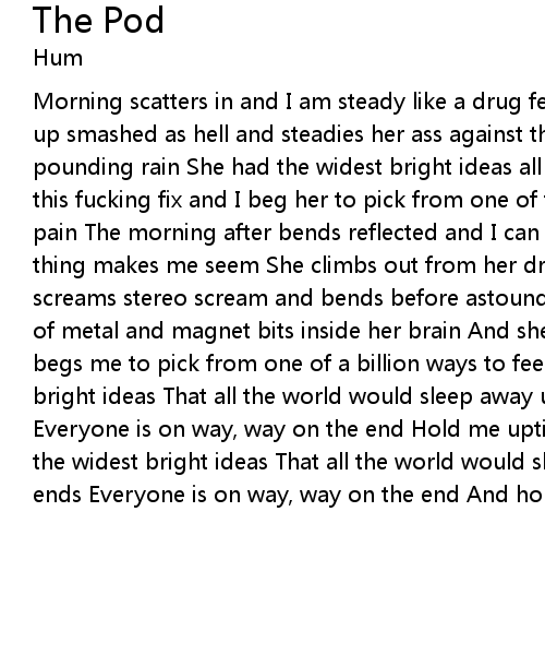 | Morning scatters in and I am steady like a drug feeling out this one She wakes up smashed as hell and steadies her ass against the rail and bends before the pounding rain She had the widest bright ideas all along about my love And I need this fucking fix and I beg her to pick from one of the billion ways to feel no pain The morning after bends reflected and I can hardly stand the way this whole thing makes me seem She climbs out from her dream with lungs hardly as she screams stereo scream and bends before astounding rain She's got a system made of metal and magnet bits inside her brain And she opens her box of tricks and begs me to pick from one of a billion ways to feel no pain She had the widest bright ideas That all the world would sleep away until the nightmare ends Everyone is on way, way on the end Hold me uptight, let me breathe now She had the widest bright ideas That all the world would sleep away until the nightmare ends Everyone is on way, way on the end And hold me uptight, let me breathe now |