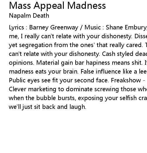 Lyrics : Barney Greenway / Music : Shane Embury, Mitch Harris Tell me, assure me, I really can't relate with your dishonesty. Dissention seeking attention, yet segregation from the ones' that really cared. Tell me, assure me, I really can't relate with your dishonesty. Cash styled deadhead, no conscience or opinions. Material gain bar hapiness means shit. It means shit. Mass appeal madness eats your brain. False influence like a leech, sucking dry your veins. Public eyes see fit your second face. Freakshow - fooling those who imitate. Clever marketing to dominate screwing those who gave you your big break. And when the bubble bursts, exposing your selfish crap, you'll cry for sympathy... we'll just sit back and laugh. |