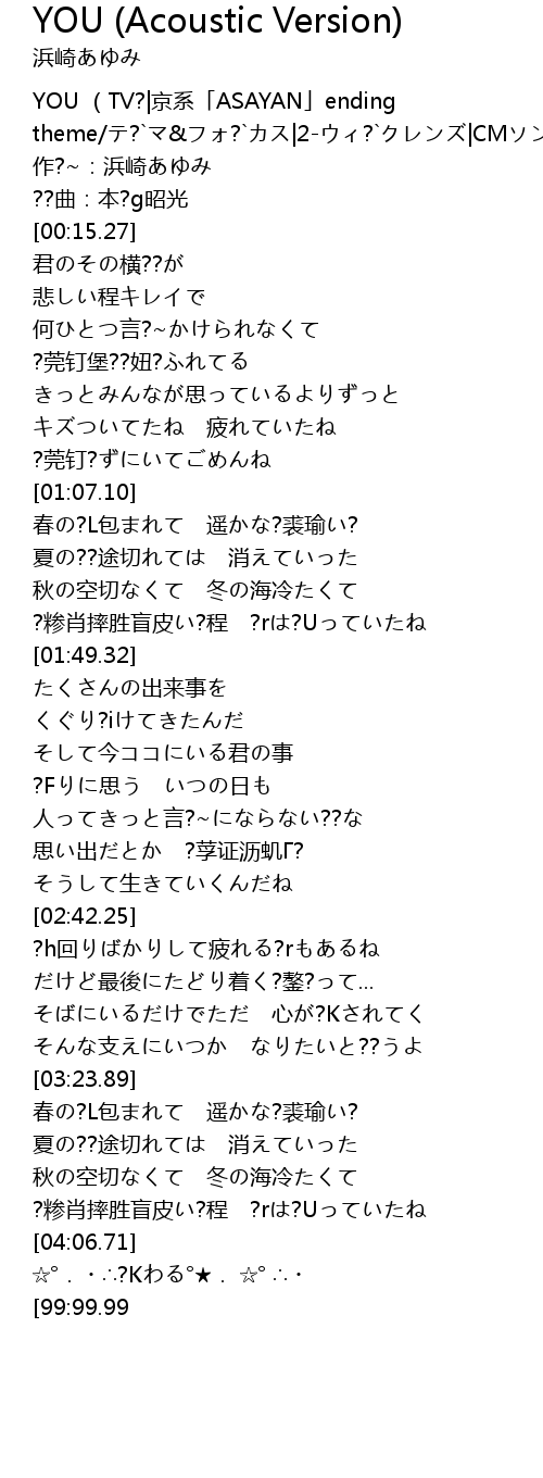 [00:01.35] YOU (TV?|京系「ASAYAN」ending theme/テ?`マ&フォ?`カス|2-ウィ?`クレンズ|CMソング)