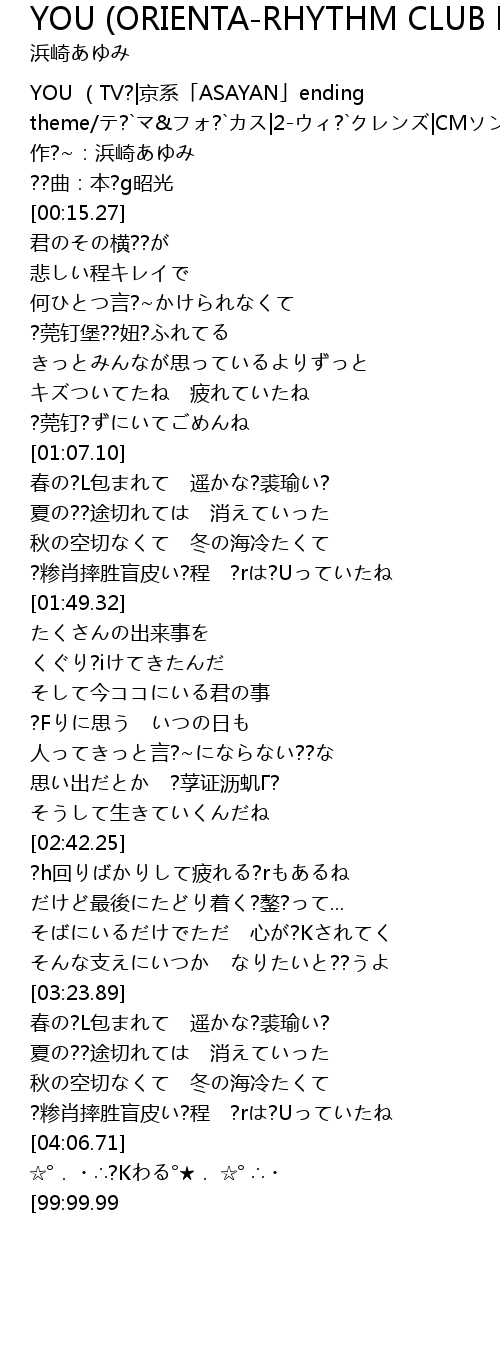 | [00:01.35] | YOU (TV?|京系「ASAYAN」ending theme/テ?`マ&フォ?`カス|2-ウィ?`クレンズ|CMソング) |
