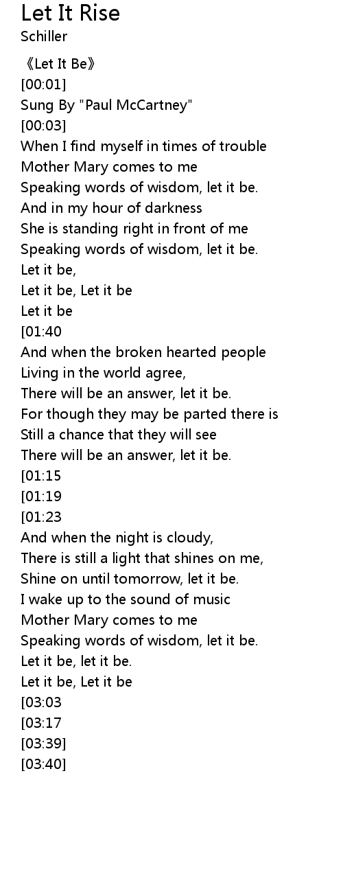 | [02:26][01:40][00:40] | Whisper words of wisdom, let it be. |