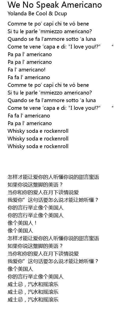 | [00:05.65] | Si tu le parle ' mmiezzo americano? |