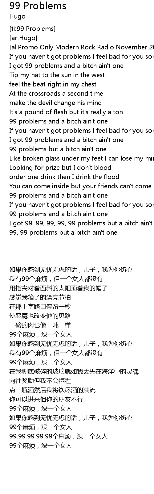 I got 99, 99, 99, 99, 99 problems but a bitch ain't one |
