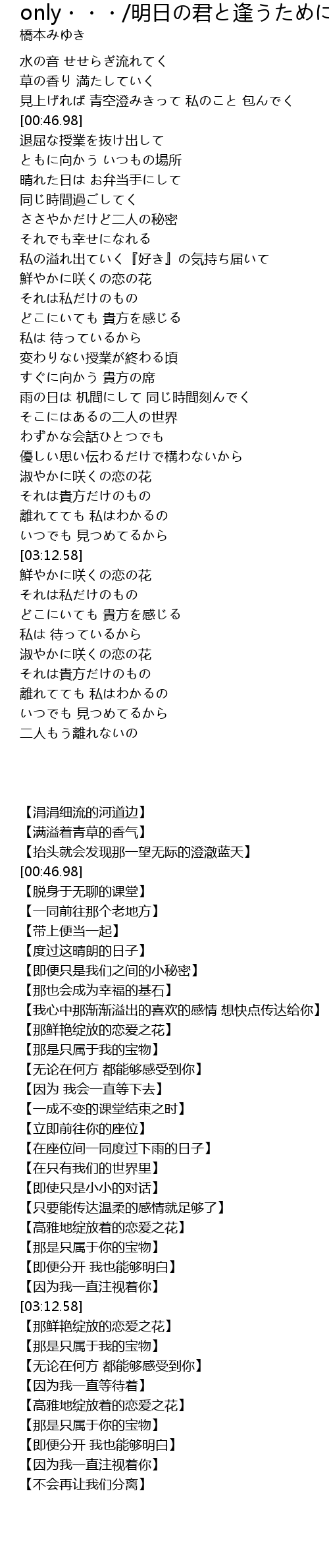 | [01:30.14] | 私の溢れ出ていく『好き』の気持ち届いて |