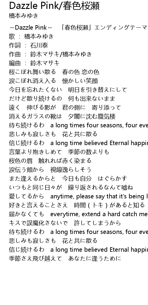 | [00:00.00] | ~Dazzle Pink~ 「春色桜瀬」エンディングテーマ |
