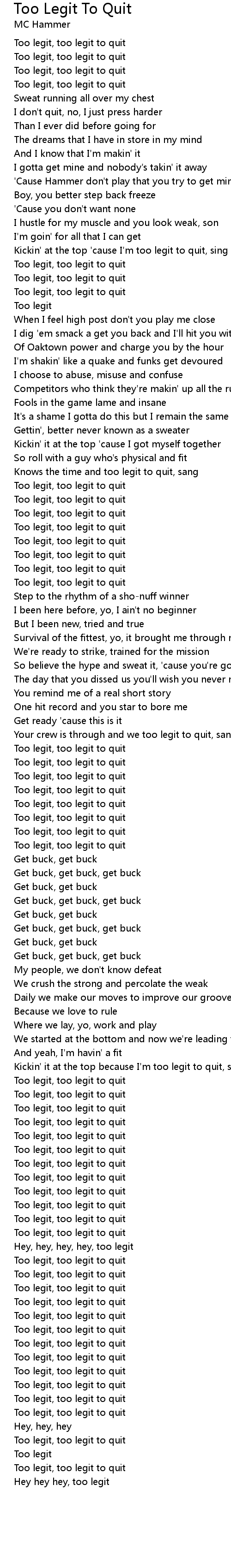 | Kickin' at the top 'cause I'm too legit to quit, sing | |