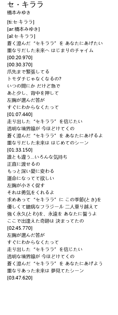 | [03:34.510] | 蒼く澄んだ“セキララ”を あなたにあげよう |