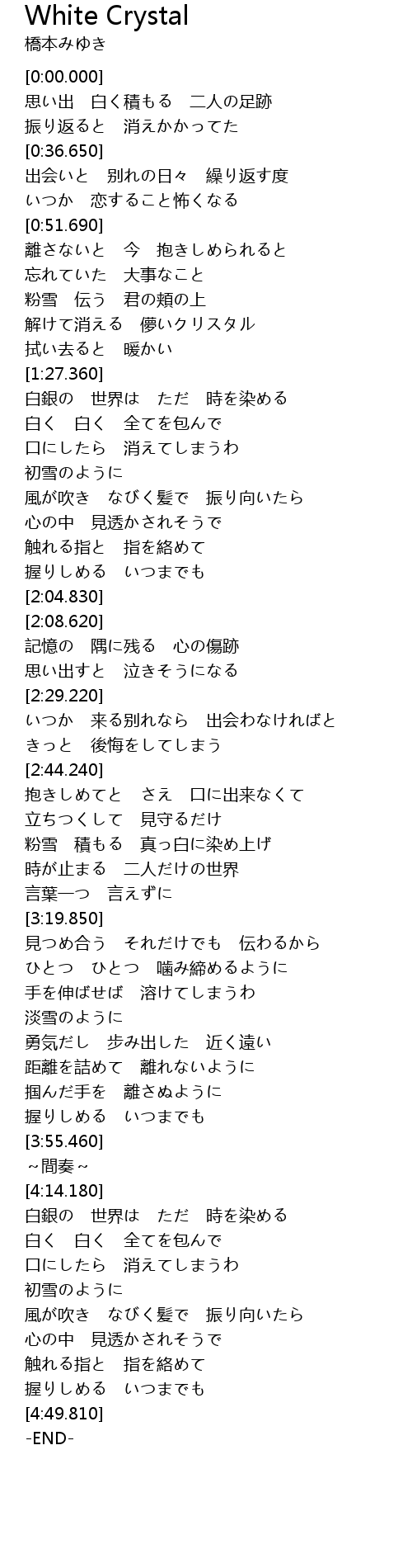 | [4:19.720] | 白く 白く 全てを包んで |