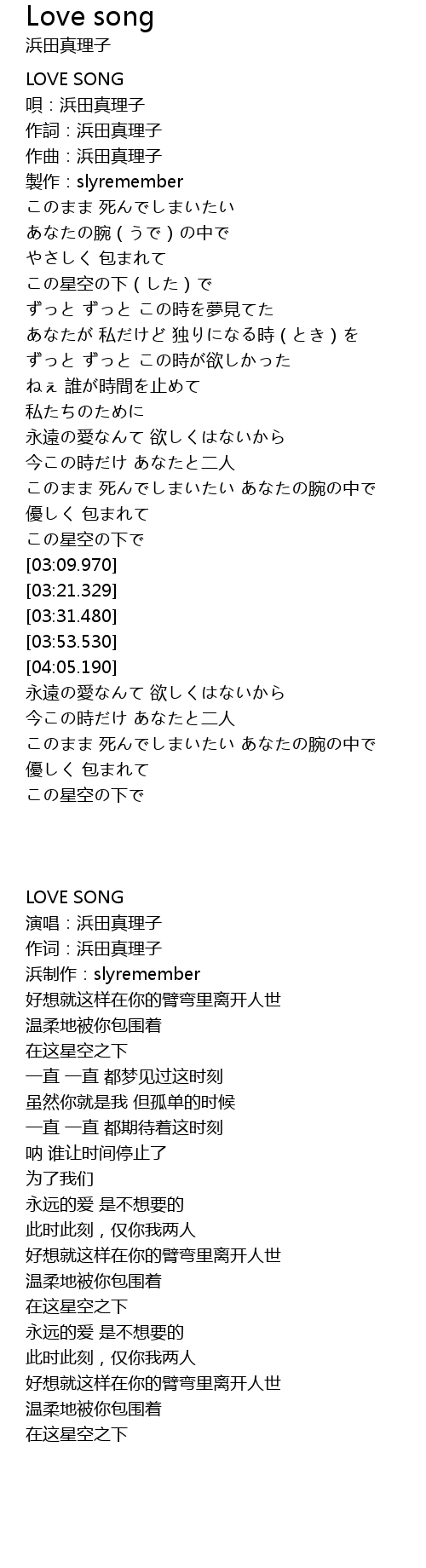 | [00:17.90] | このまま 死んでしまいたい あなたの腕(うで)の中で |