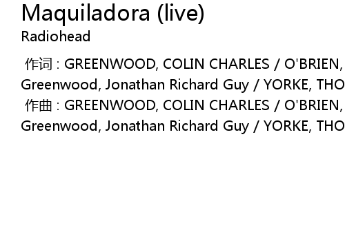 | [00:00.000] | zuò cí : GREENWOOD, COLIN CHARLES O' BRIEN, EDWARD JOHN Greenwood, Jonathan Richard Guy YORKE, THOMAS EDWARD SELWAY, PHILIP JAMES |
