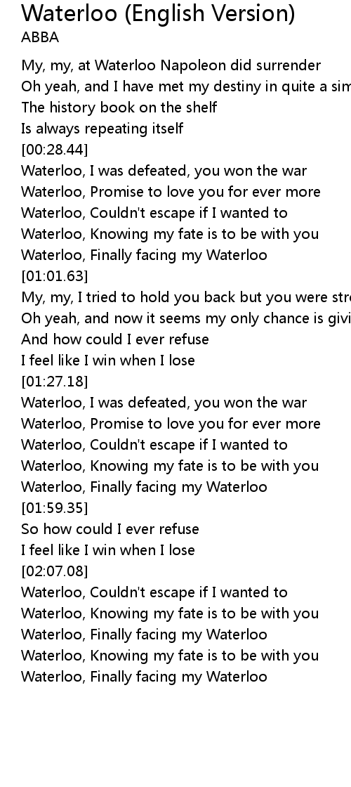 | [01:28.00] | Waterloo, I was defeated, you won the war |