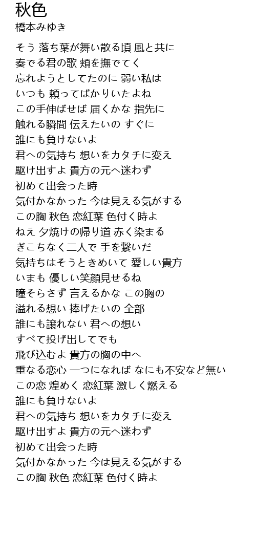 | [04:36.37] | この胸 秋色 恋紅葉 色付く時よ |