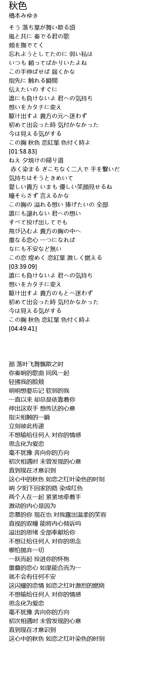 | [01:47.57] | この胸 秋色 恋紅葉 色付く時よ |