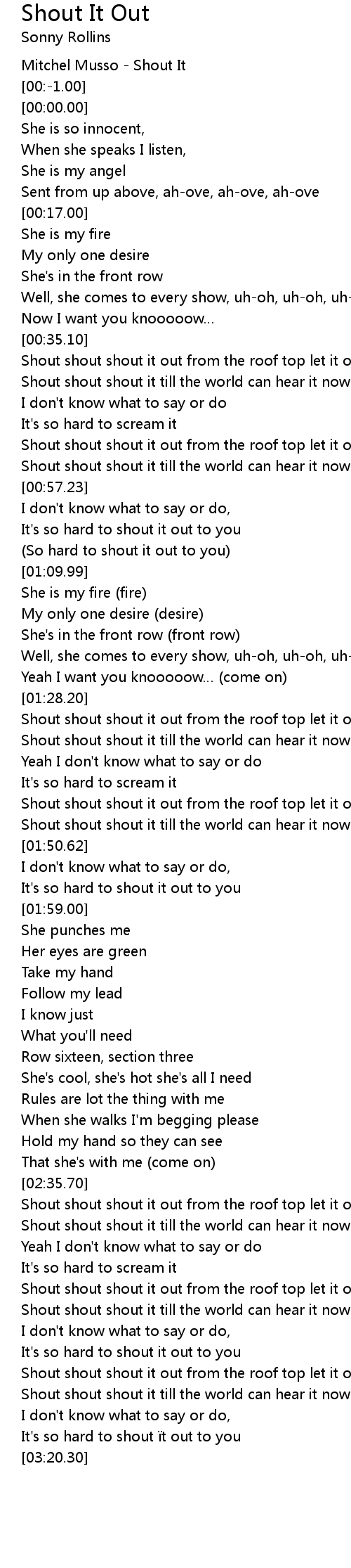 | [00:50.29] | Shout shout shout it out from the roof top let it out |