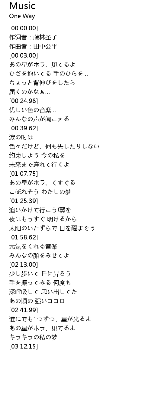 | [02:42.74] | 谁にでも1つずつ、星が光るよ |