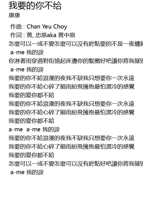 | [03:13.567] | wǒ yào de ài nǐ dōu bù gěi |